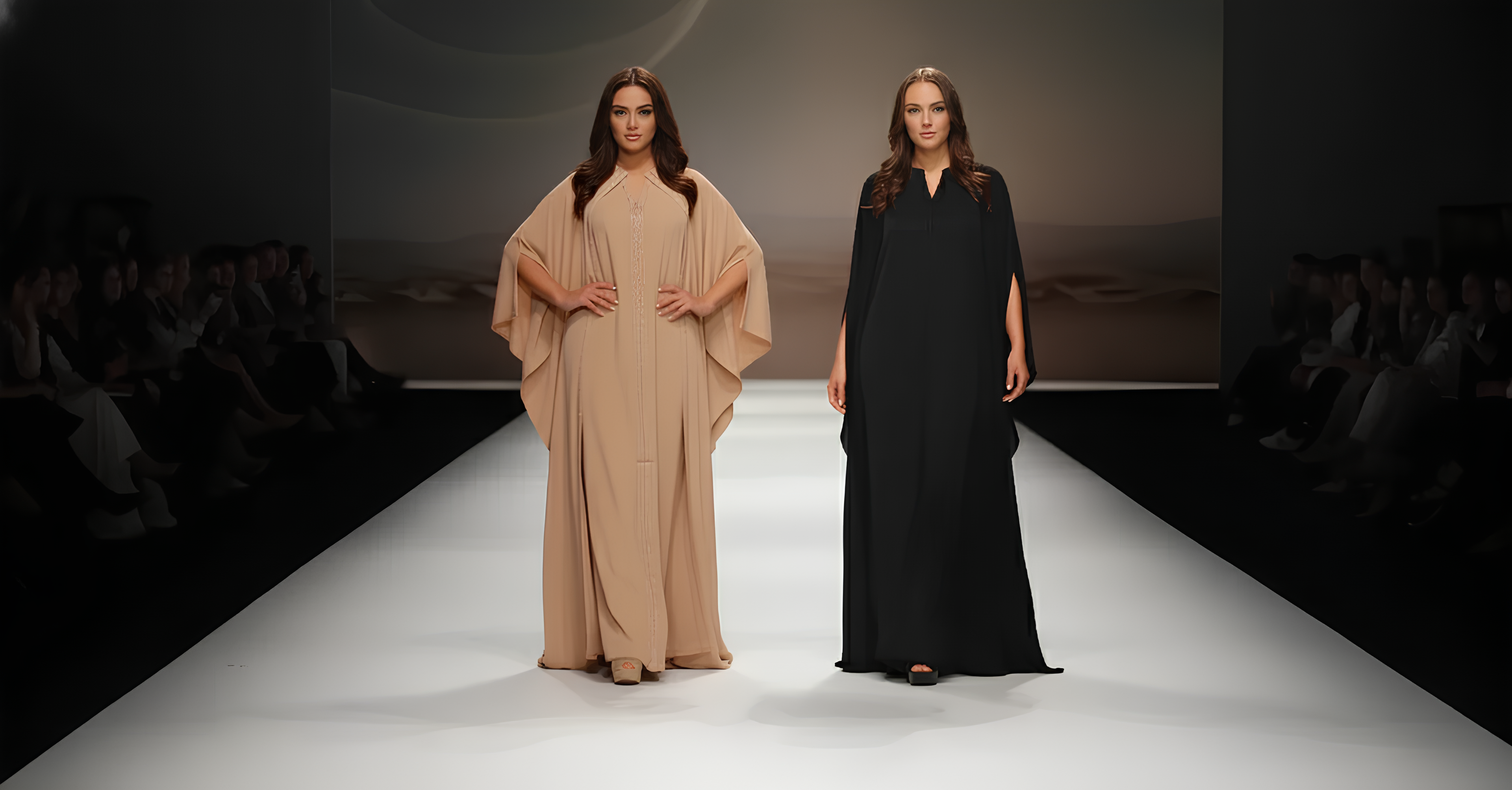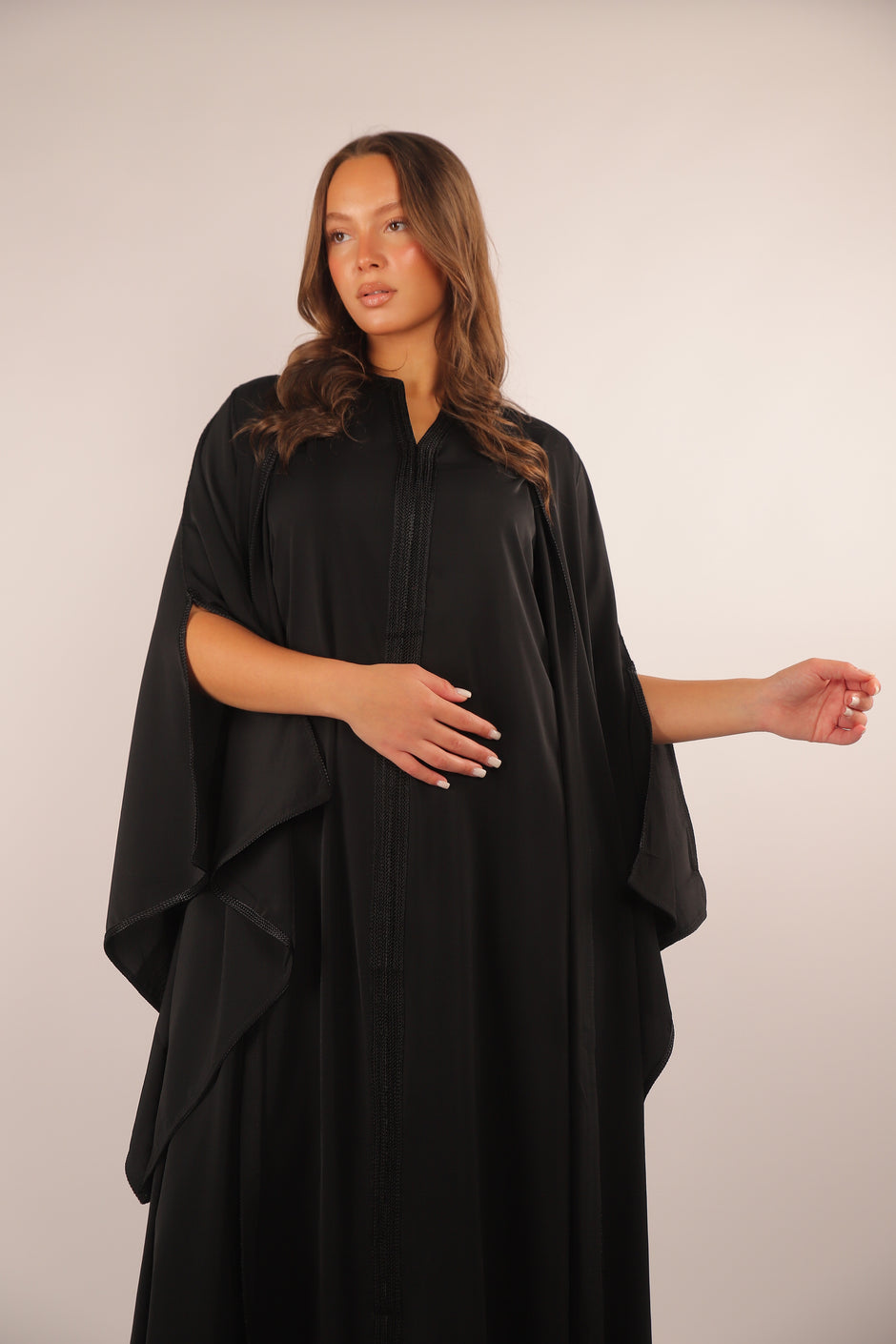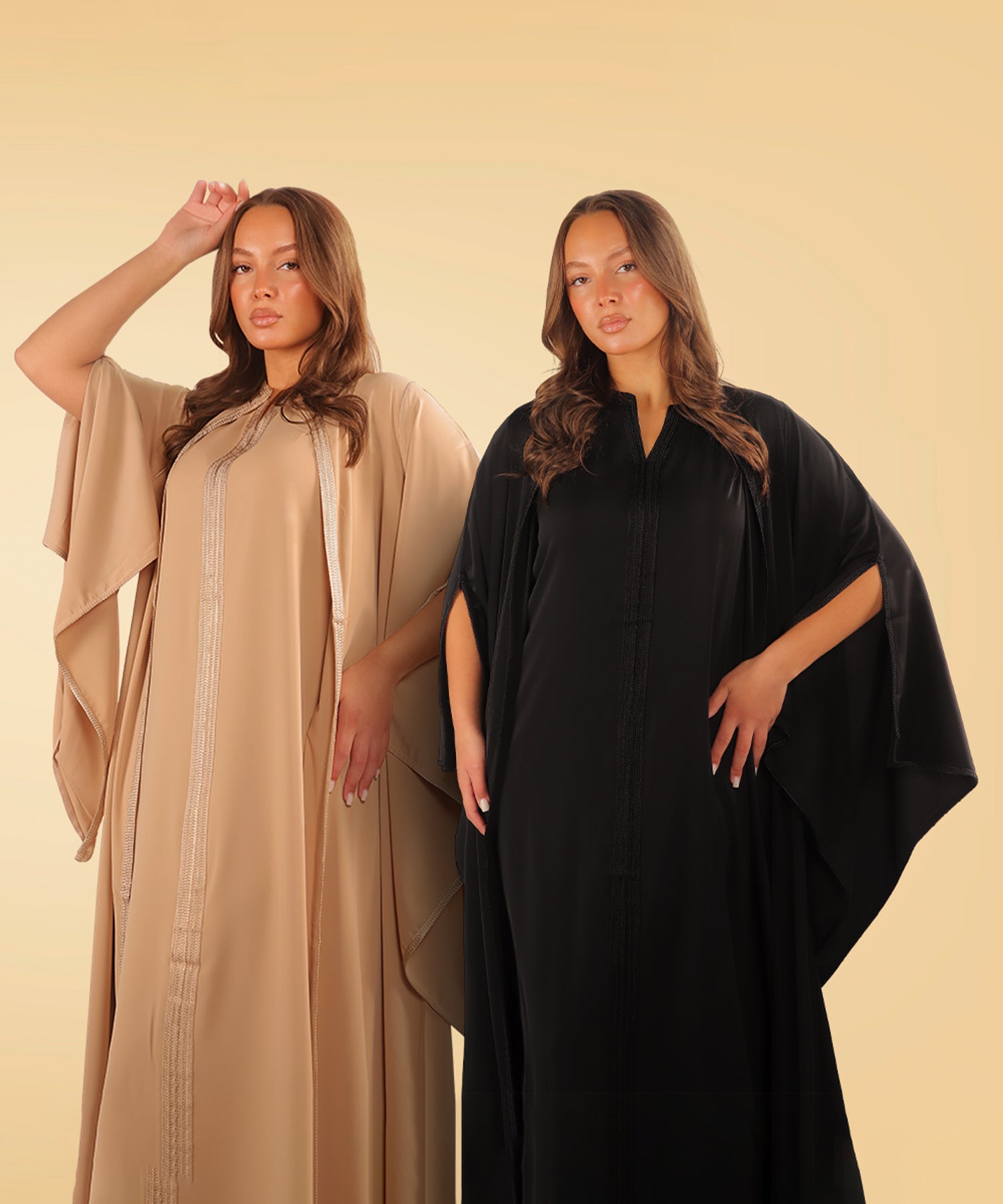 The Midnight Noir Serenity Kaftan blends tradition with modern elegance. Available in soft beige and deep black, it features delicate embroidery and flowing sleeves perfect for Ramadan nights, Eid, or any graceful occasion.